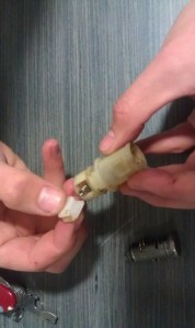 A continuación extraemos el bombín y liberamos el clip que sujeta la parte interior.