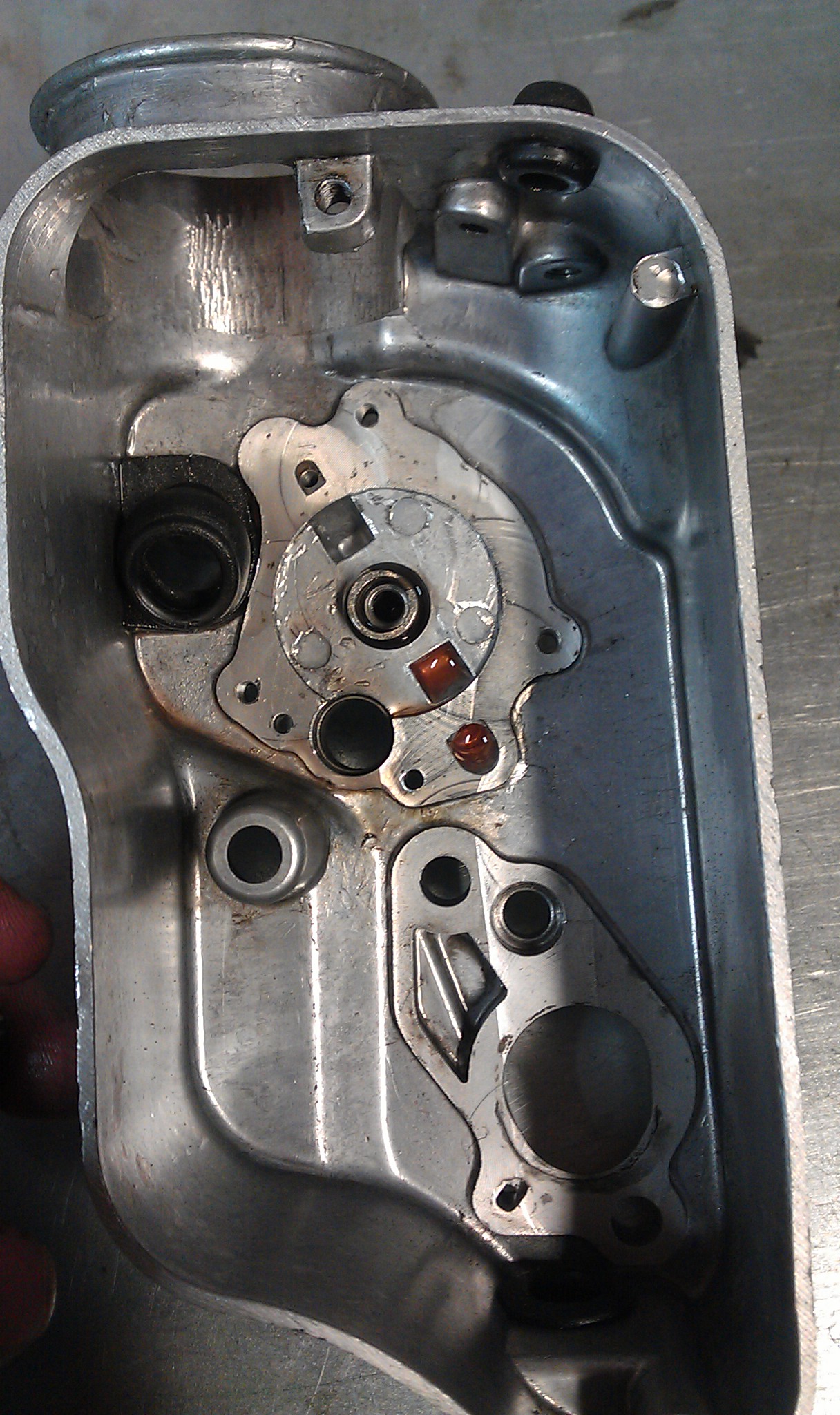 El carter con su ventana de entrada de gases, en este punto se «mezcla» el aceite y la gasolina «vaporizada». NOTA: Cuando uso comillas intento ser sarcastico por que mezclar y vaporizar aquí, no es que funcione muy bién, cae una gota de aceite de vez en cuando y un chorrazo de gasolina al carter.