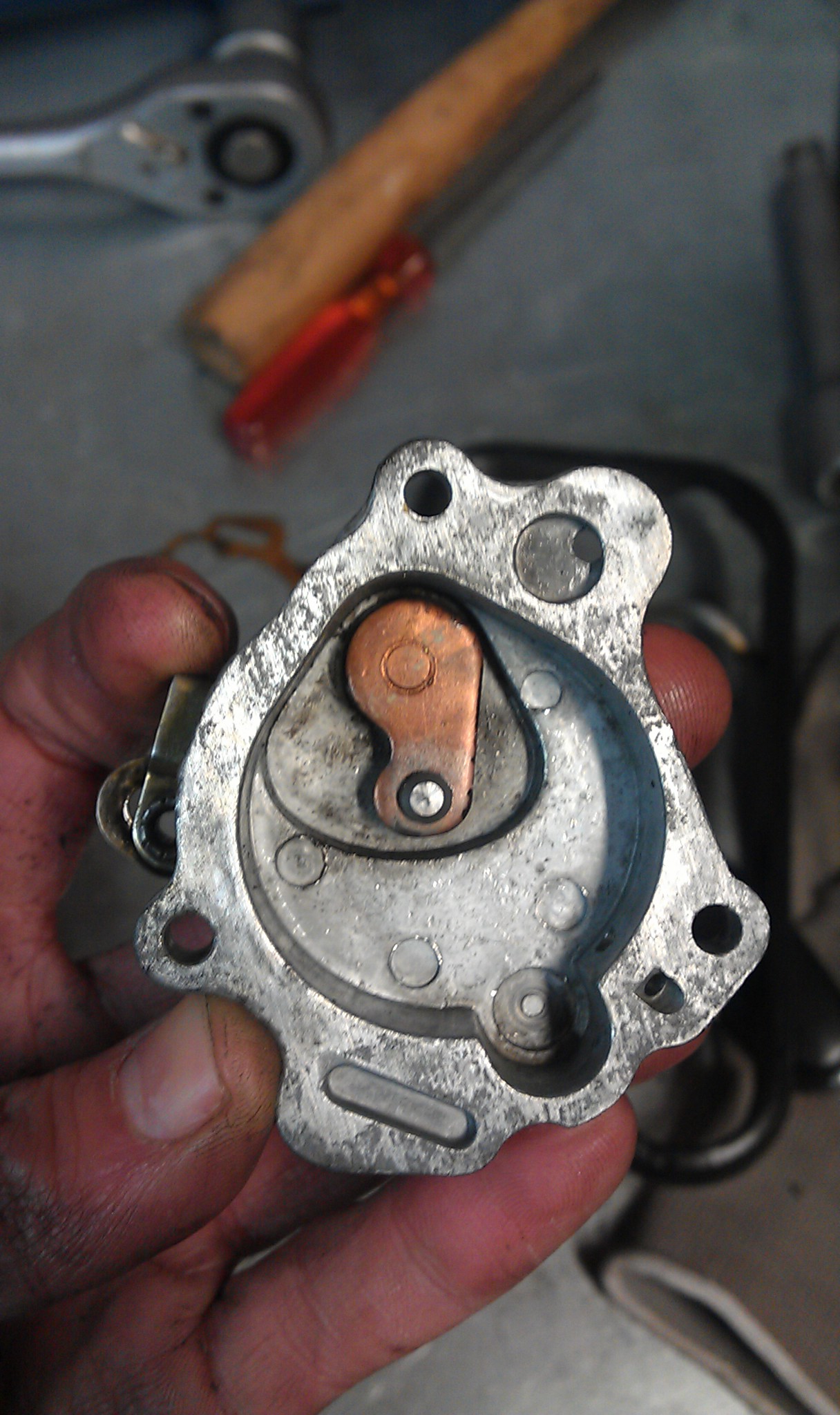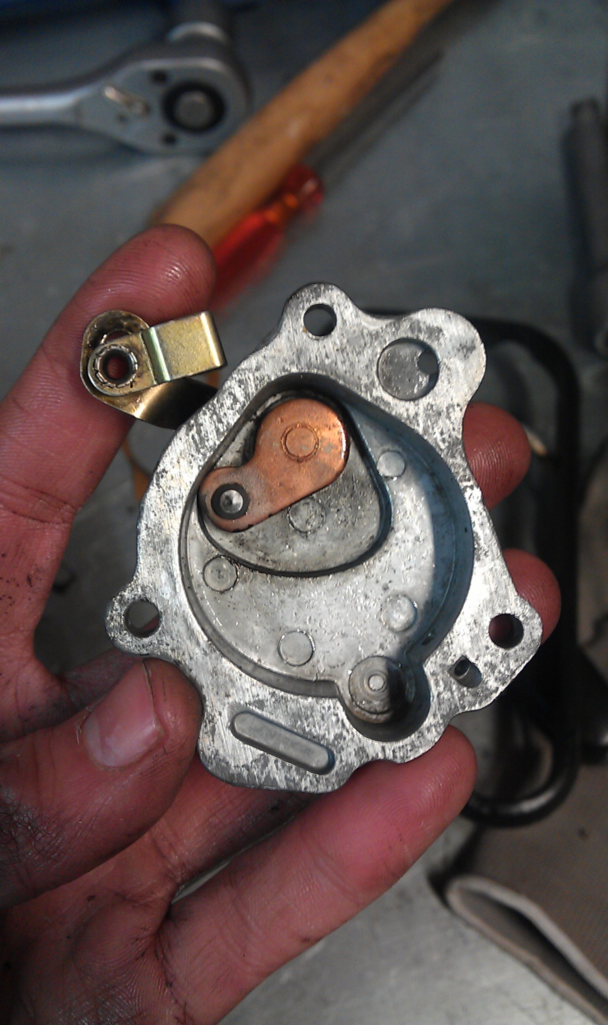 Y esta es la tapa que nos encontramos debajo del carburador a la que enganchamos el cable del acelerador, si está en reposo el eje se queda en el centro y si aceleramos se mueve hacia fuera haciendo que baje más la rueda, de tal forma que el eje-pistón bombéa más cantidad de aceite al carter.