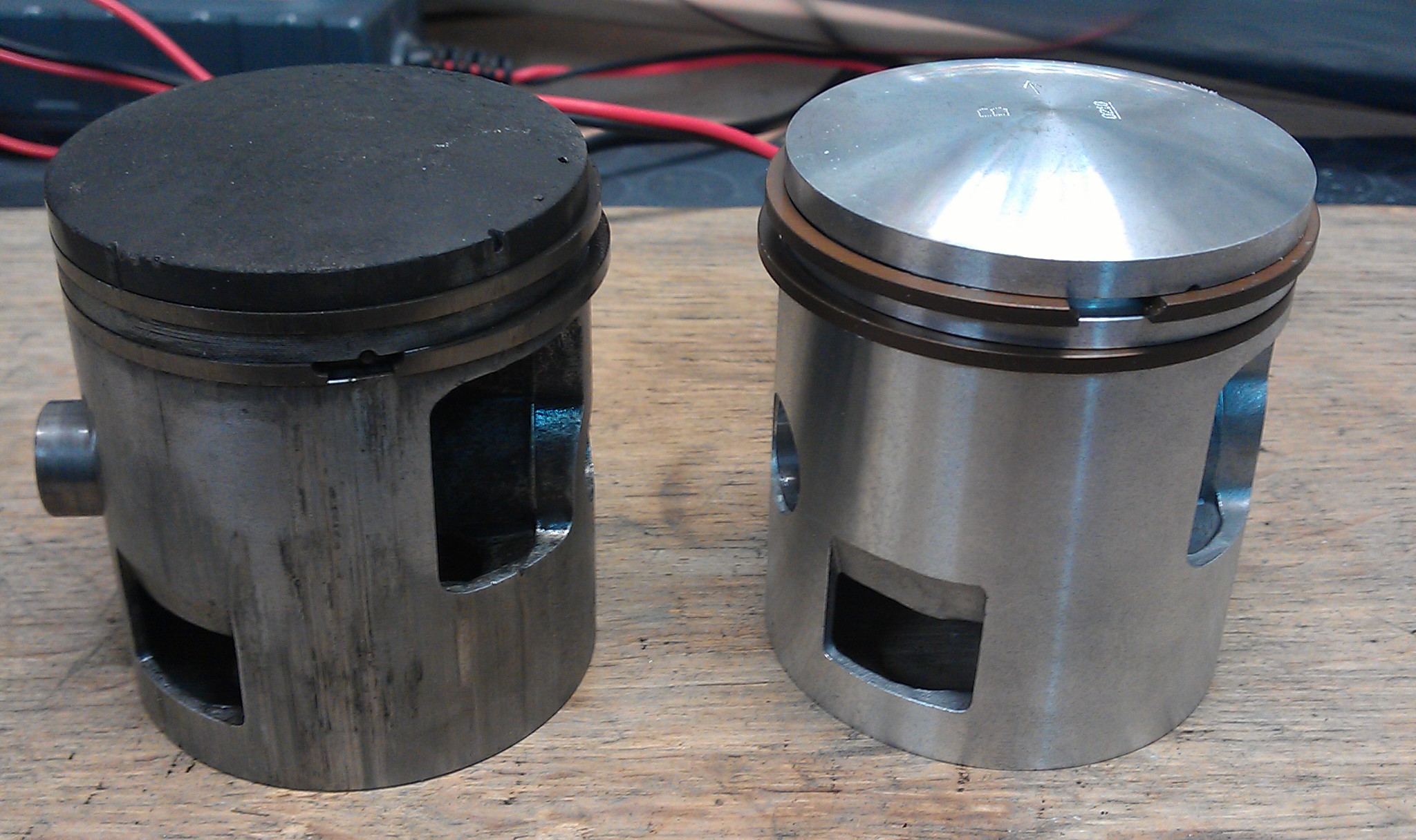 Monté un pistón Barikit, producto nacional, dimensionado unas décimas. el viejo se le ve rayado por temperatura y con incrustaciones del rodamiento.