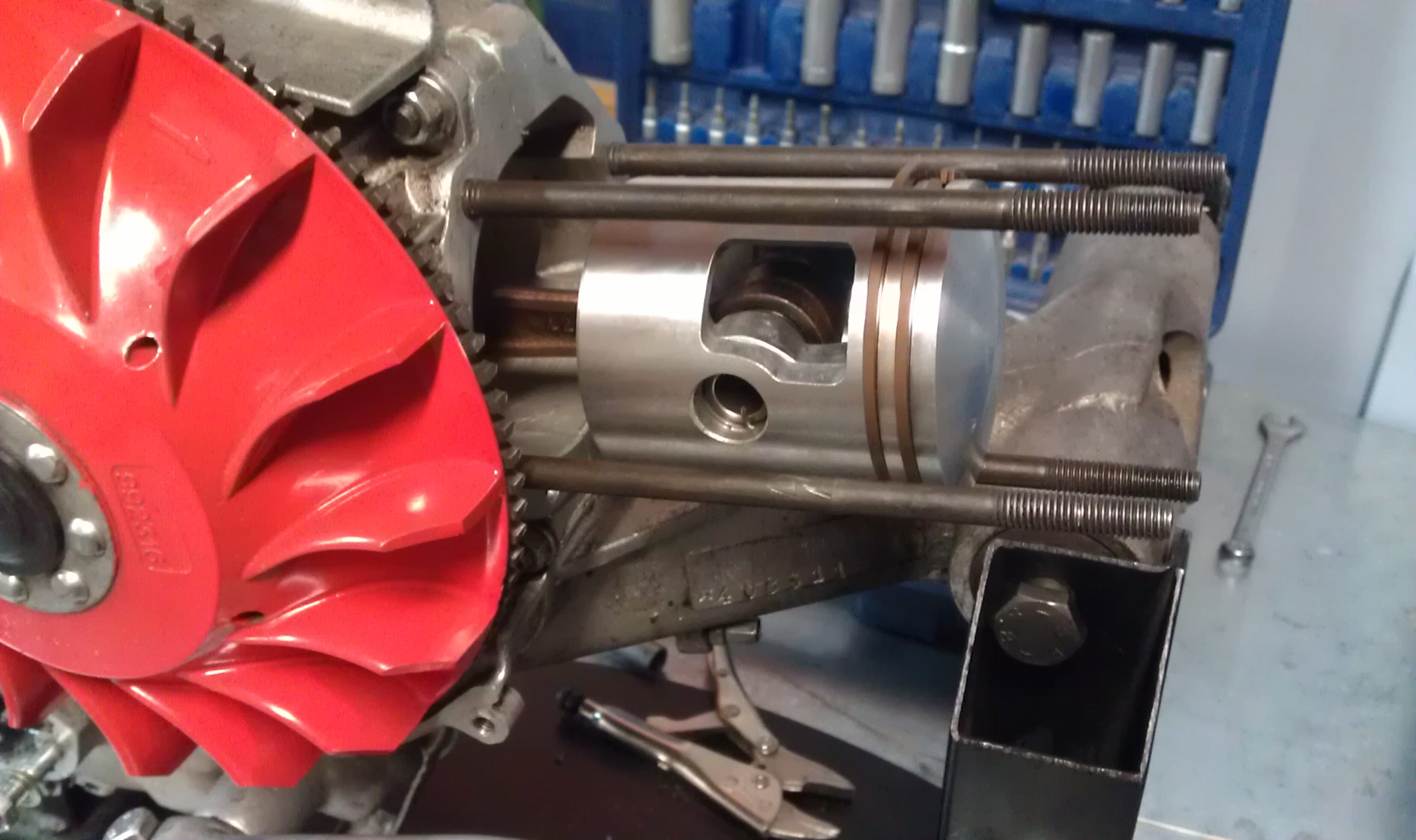 Pistón colocado con sus presillas, cuidado al colocarlas, pueden saltar por el taller o rayar el pistón, son de un acero muy duro y cuesta ponerlas, yo uso alicates de puntas y un poco de maña. Aconsejable cambiar el rodamiento de agujas del pistón, unos 6 euros.