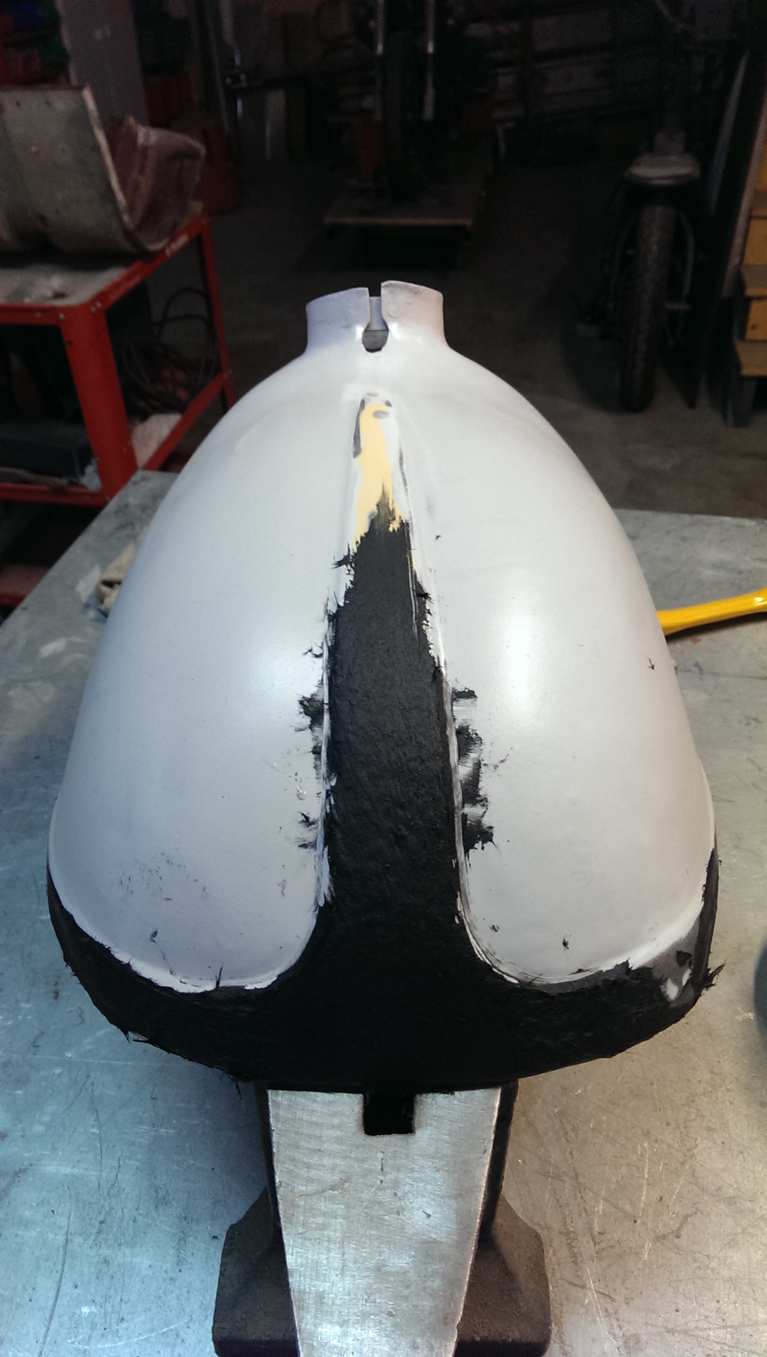 Busqué ideas para acabar las formas de el depósito pero al final opté por algo simple, unas chapitas a medida con acabado en carbono que sujetan el clausor, botón de warning, antinieblas y reset de ABS.
