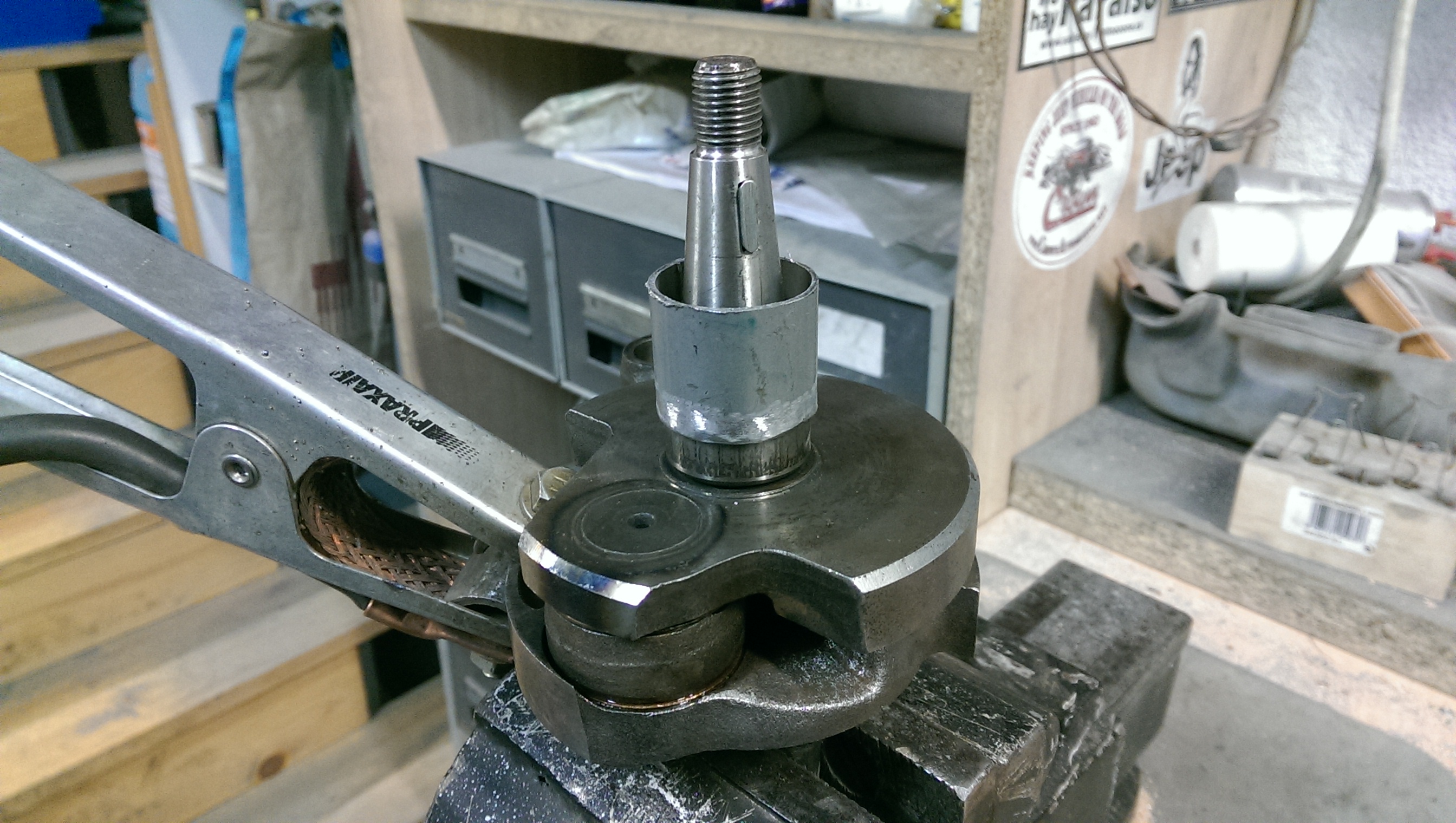 Extracción del casquillo, mediante un tubo soldado. El casquillo usado es para tirar, en el kit de recambio siempre viene el rodamiento junto al casquillo nuevo, así que no importa dar unos puntos de soldadura en el.